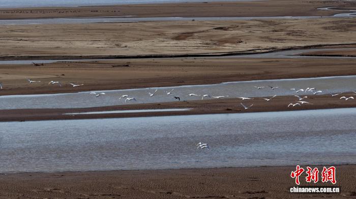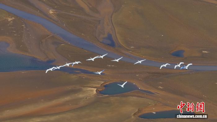 今日黄河河北启启段迎去越冬季鹅,为始冬的启启黄河添加了无穷的生气取敏捷。图为天鹅正在空中飞翔。(无人机相片) 袁洋 摄